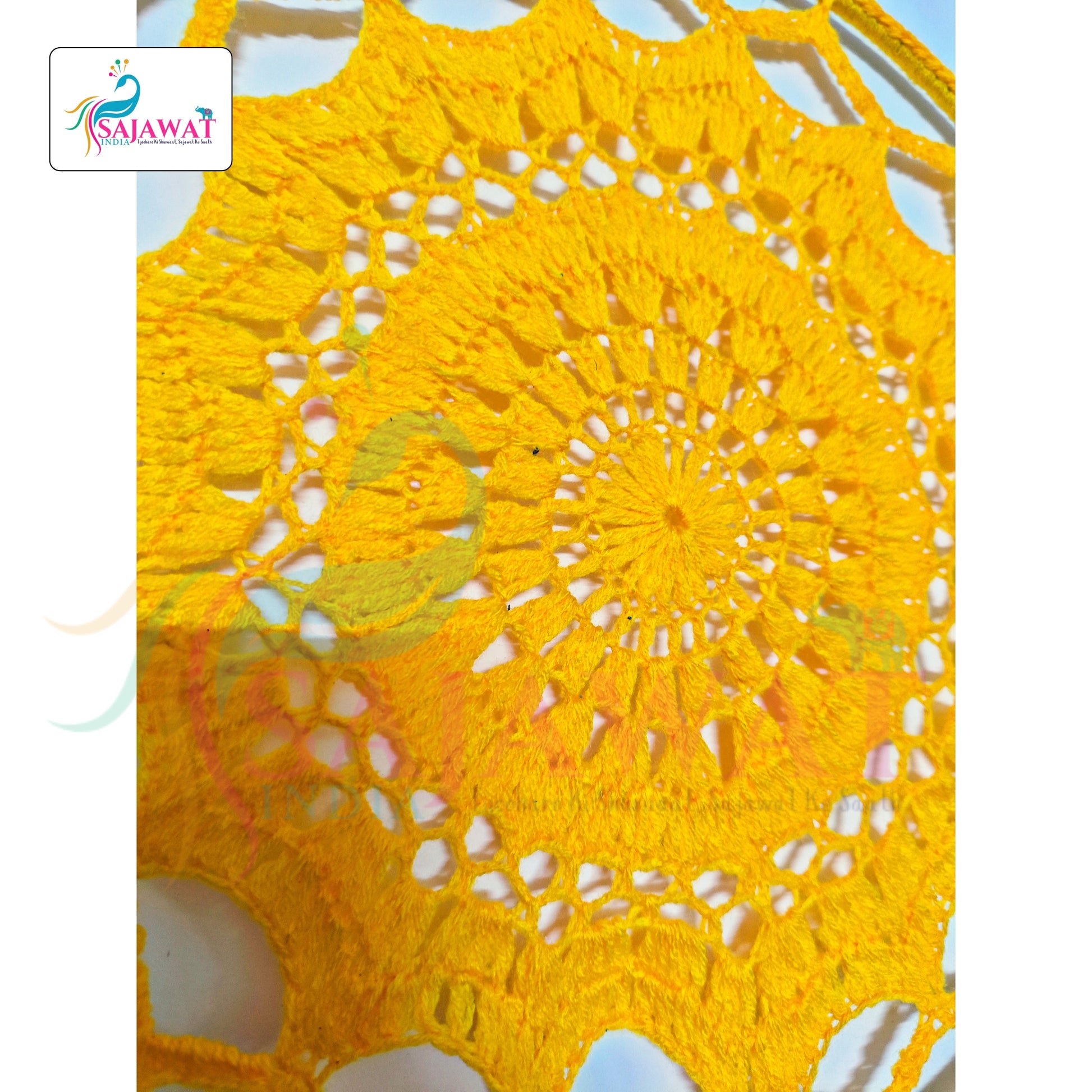 This beautiful yellow dream catcher features a sturdy metal circular frame, delicately wrapped with intricate hand crochet work. The design is enhanced with soft, silky tassels that flow gracefully, adding a touch of elegance and warmth to any room.